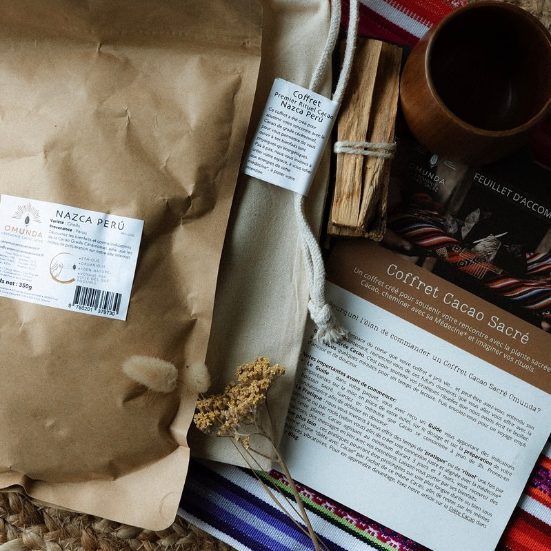 Ce coffret a été créé pour soutenir votre rencontre avec le Cacao de grade cérémoniel, pour vous permettre de vous ouvrir à ses bienfaits tant physiques qu’énergétiques. Pas à pas, nous vous invitons à créer votre espace, à vous relier aux énergies de cette médecine*, à poser votre intention.