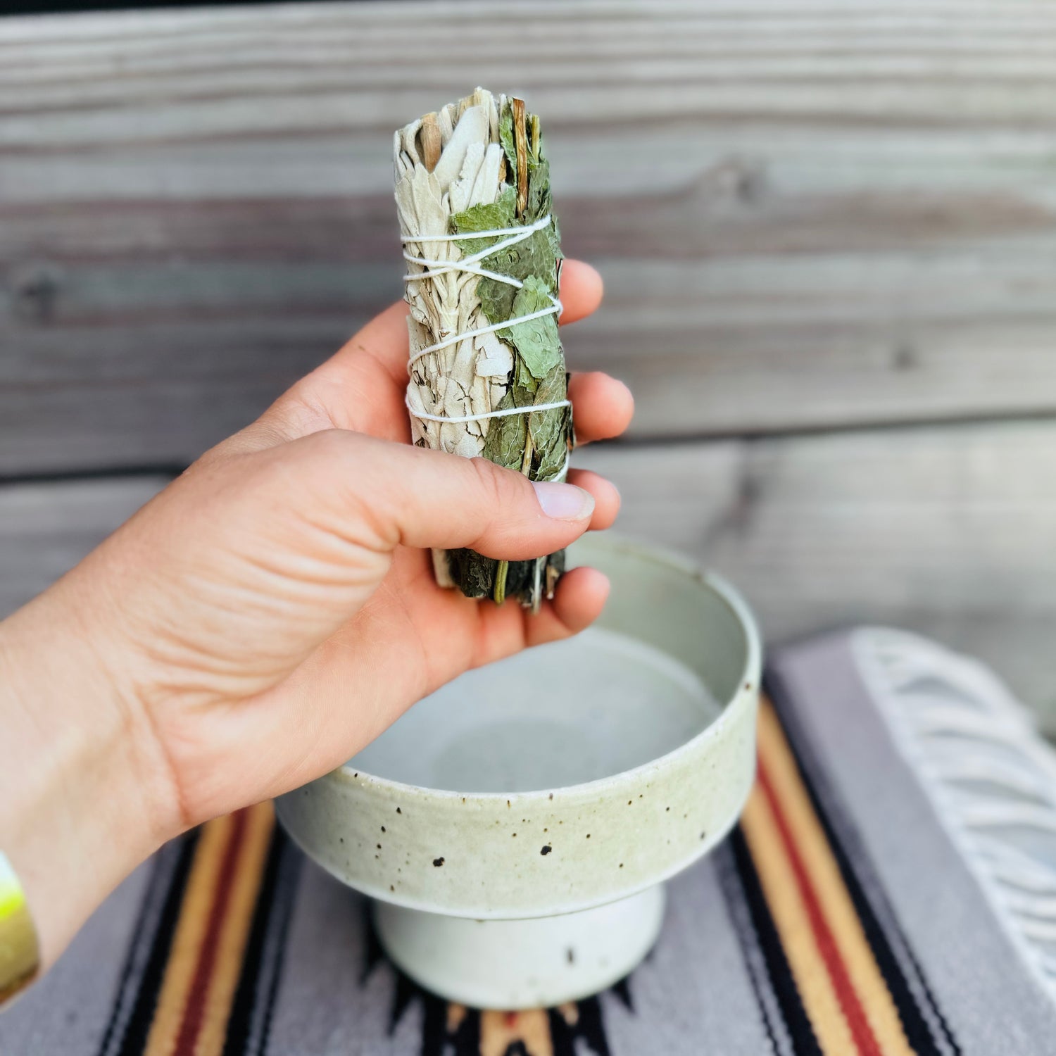 Durant la fumigation, votre bouquet va se consumer sur un récipient non-inflammable adapté, tel qu’une coupelle de terre cuite ou de verre, ou encore un coquillage épais, permettant de retenir le bâton brûlant et de ramasser les cendres. Lors des cérémonies sacrées, une plume d’aigle est utilisée pour dissiper la fumée et chaque accessoire doit avoir été purifié avant d’être utilisé.