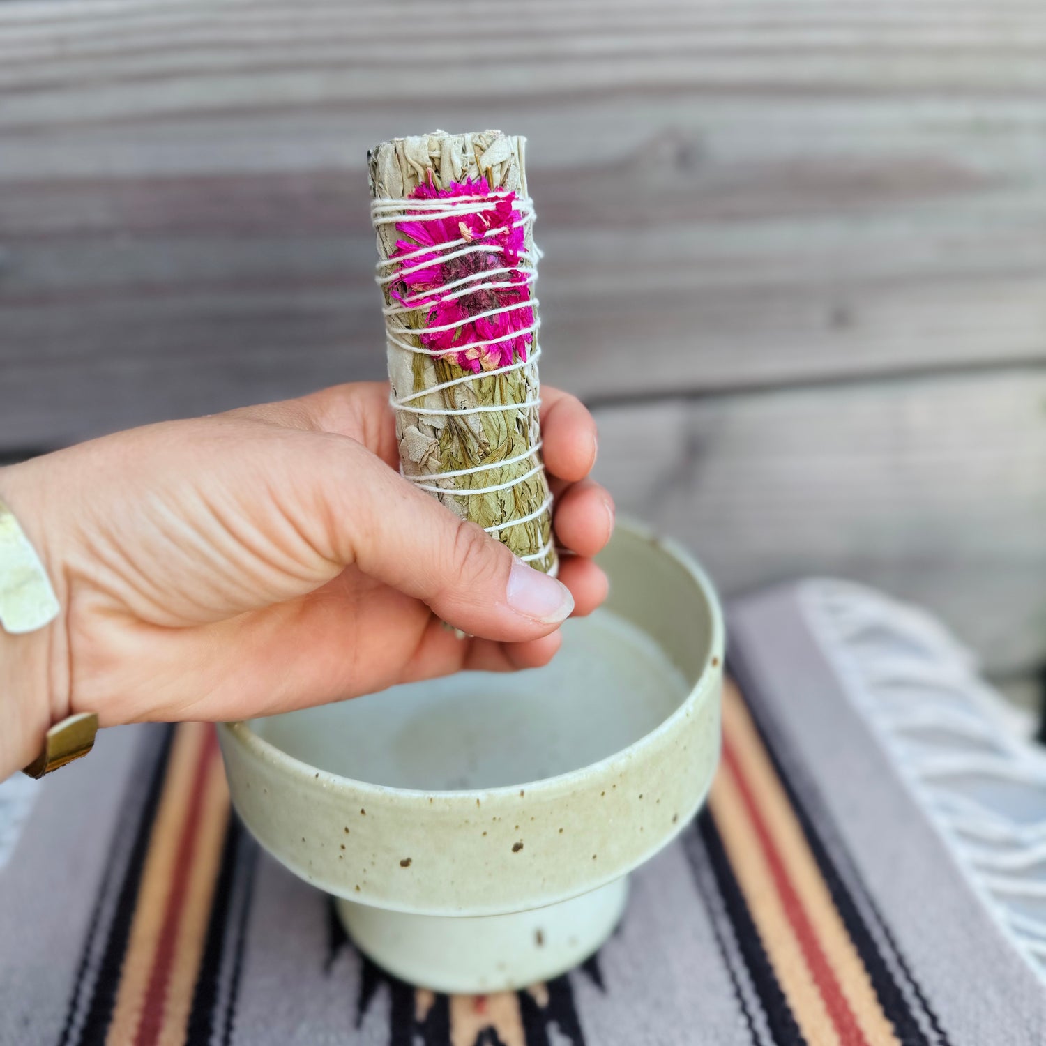 Durant la fumigation, votre bouquet va se consumer sur un récipient non-inflammable adapté, tel qu’une coupelle de terre cuite ou de verre, ou encore un coquillage épais, permettant de retenir le bâton brûlant et de ramasser les cendres. Lors des cérémonies sacrées, une plume d’aigle est utilisée pour dissiper la fumée et chaque accessoire doit avoir été purifié avant d’être utilisé.