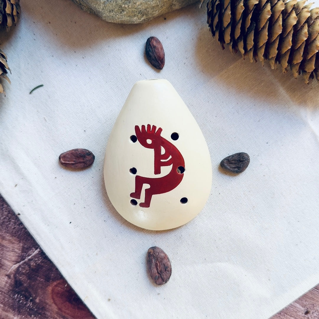 Ocarina en argile fabriqué à la main au Pérou. Le dessin représente une forme humaine qui créé le lien lors des célébrations avec le Cacao Cérémoniel.