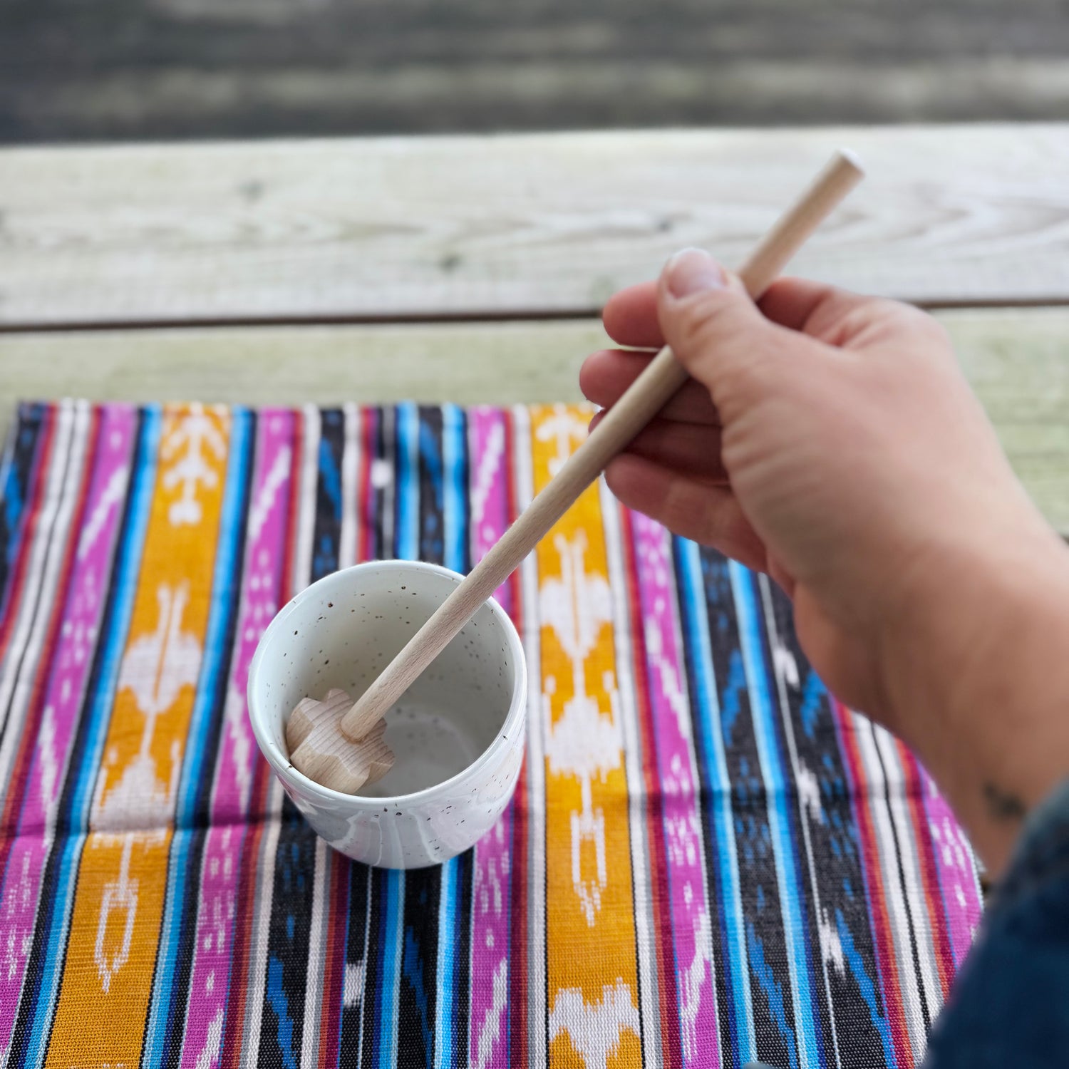 Message de Julie, notre fondatrice : "j'ai longtemps parcouru les brocantes, épluché des livres d'antan pour retrouver des visuels des fouets traditionnels de nos terres, qui existaient bien avant nos fouets classiques à tige en acier. Il s'utilise comme le Molinillo Mexicain : on le serre entre nos mains, puis en le faisant rouler d'un pomme de main à l'autre, on obtient ce mouvement qui mélange et dynamise notre recette, et ici notre Cacao".