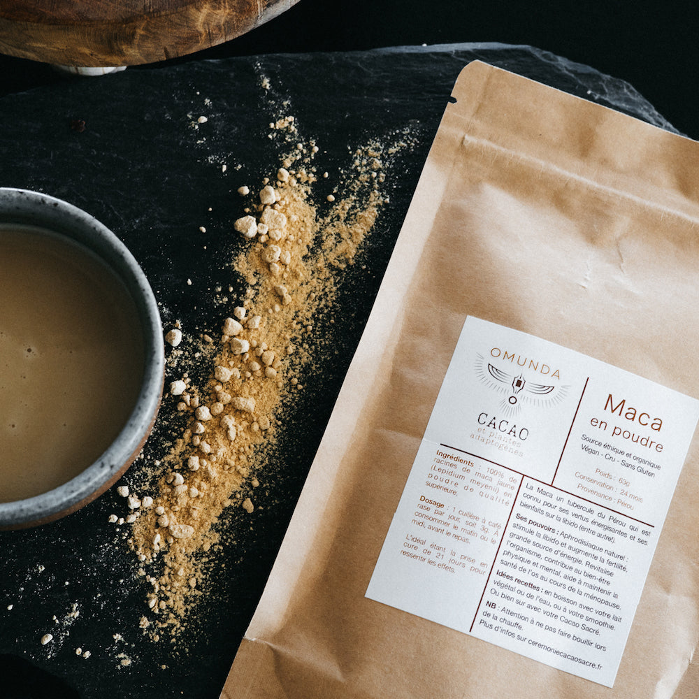 -Notre recette préférée : lait de noisette 150ml, sirop d'érable 1/2 c.à.c, poudre de Maca Jaune 1 c.à.c.